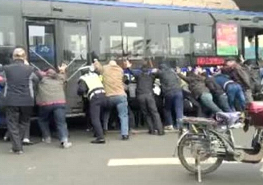 버스에 깔린 사람을 구하기 위해 수 십명의 승객들이 힘을 합치는 모습이 전해져 잔잔한 감동을 주고 있다.
