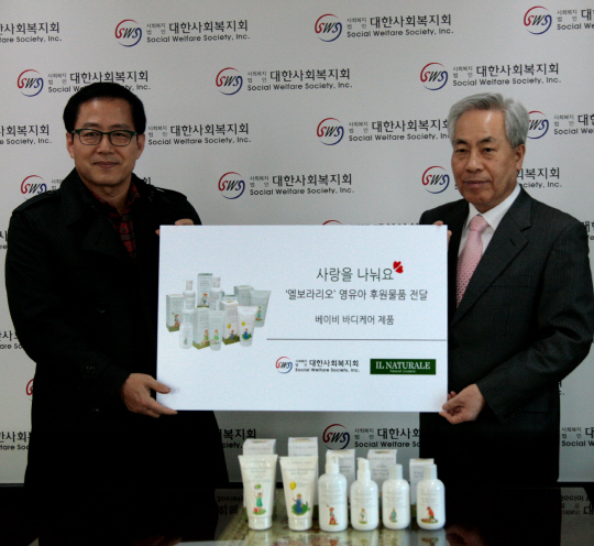 이탈리아 천연화장품 '일 나뚜랄레'가 지난 19일 서울 강남구 대한사회복지회에 200만원 상당의 엘보라리오 베이비 보디 제품을 전달했다.