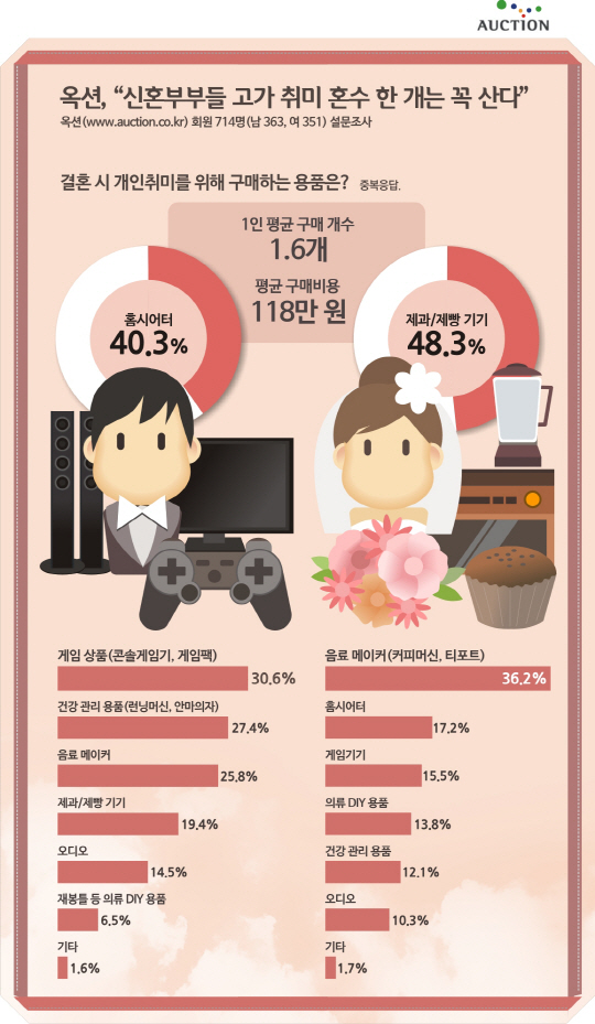 신혼 살림 장만 시 취미생활을 위해 남성은 홈시어터와 게임기 등 엔터테인먼트 상품을, 여성은 오븐과 커피머신 등 주방기기 상품을 주로 구매하는 것으로 나타났다.
