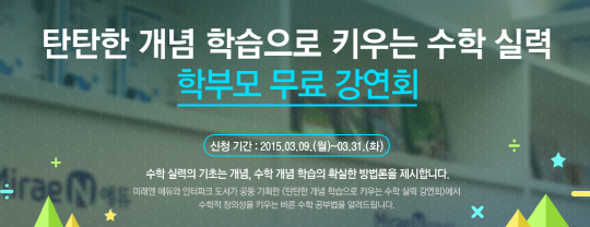 교육출판전문기업 ㈜미래엔(구 대한교과서)이 인터넷서점 인터파크도서와 공동 기획으로 4월 1일과 3일, 2회에 걸쳐 초등 수학 교육에 관심이 많은 학부모를 위한 강연회를 개최한다.