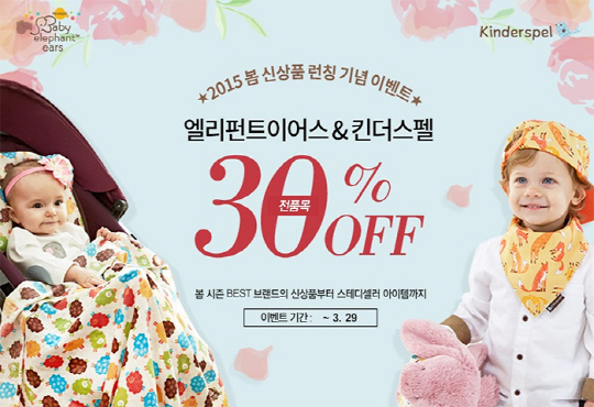 이번 이벤트는 꽃샘추위가 지나가고 갑자기 찾아올 봄을 준비하는 고객을 위해 기획됐다. 킨더스펠과 엘리펀트이어스는 쁘띠엘린의 봄 나들이 대표 브랜드로 의류와 악세서리, 유모차나 카시트에 장착할 수 있는 침구류 등이 있다. 이들은 최근 기존 제품과 다른 디자인과 기능의 2015 S/S 신제품을 출시하며 주목받고 있는 브랜드다.