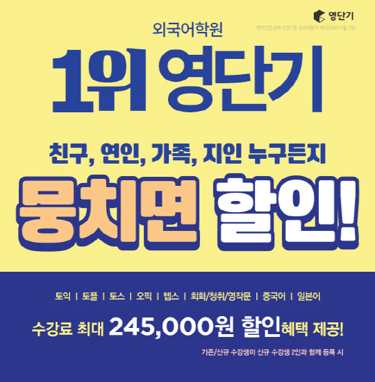 영단기는 친구와 함께 영단기어학원을 등록하면 무조건 수강료를 할인해 주는 '뭉치면 할인' 이벤트를 실시한다. 친구나 가족, 연인, 지인 등 관계없이 신규회원을 포함해 2인이 영단기어학원을 등록하면 두 명 모두 강좌 수강료의 40%를 할인 받을 수 있다. 3명이 등록하면 세 명 모두 수강료의 50%를 할인해준다.