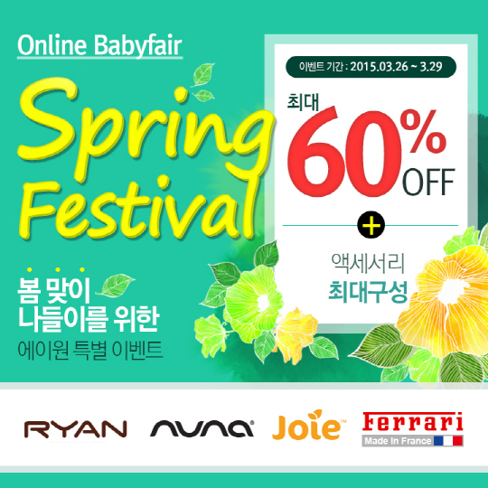 육아용품 전문기업 (주)에이원이 봄맞이 나들이 시즌을 맞아 29일까지 에이원베이비 자사몰에서 온라인 베이비페어 '스프링 페스티벌(Spring Festival)'을 진행한다.