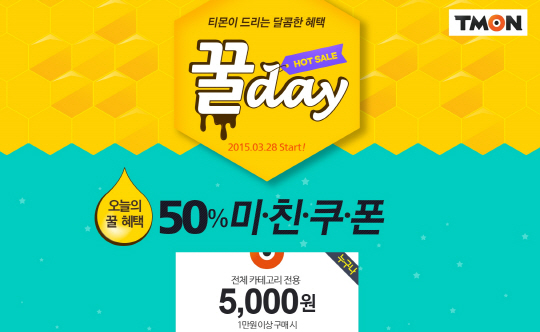 티켓몬스터(대표 신현성)가 운영하는 국내 대표 소셜커머스 티몬(www.tmon.co.kr)이 31일까지 도서 및 환금성 제품을 제외한 지역, 패션·뷰티, 쇼핑, 컬쳐, 여행·레저 등 전체 카테고리 모든 상품을 대상으로 1만원 이상 구매 시 5000원 할인쿠폰을 제공하는 '꿀day' 프로모션을 실시한다.