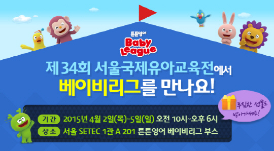 ㈜튼튼영어의 영유아 브랜드 '베이비리그'가 4월 2일부터 5일까지 대치동 SETEC에서 진행되는 '제34회 서울국제유아교육전'에 참여한다.