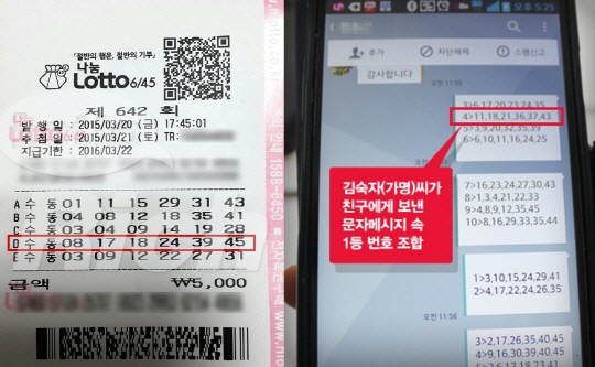 40대 직장인 김숙자(가명) 씨는 해당 포털사이트 회원으로 4개월 전부터 매주 15조합의 로또 번호를 제공받아 로또를 구매해왔다. 로또 1등 당첨을 꿈꾸며 매주 로또를 해온 김씨는 친한 친구에게 자신이 받은 로또 조합번호를 문자로 보내줬고 정작 자신은 15조합 중에 5조합만 구매했다. 결과는 친구에게 보내준 번호 중 자신이 구매한 번호를 제외한 10조합 중에서 1등 번호가 나왔다. 1등 당첨금은 20억원이었다.