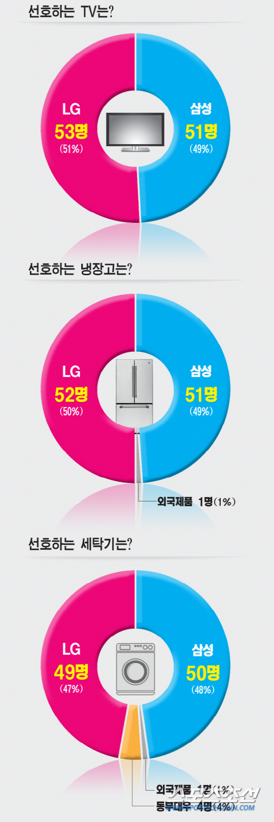 먼저 TV를 보자. 주부들은 LG전자에 조금, 아주 조금 더 점수를 줬다. 53명이 선호한다고 답했다. 삼성전자 TV에는 51명이 표를 던졌다.
