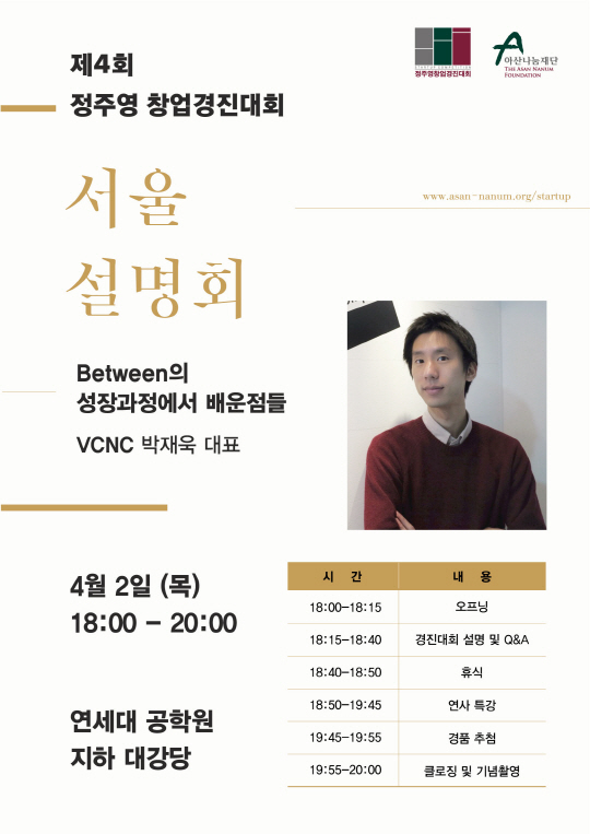 제4회 정주영 창업경진대회는 4월 1일(수)부터 서류 접수를 시작하고 발표심사, 사업실행, 결선을 거쳐 8월에 최종 우승팀을 가린다. 자세한 내용은 정주영 창업경진대회 홈페이지(www.asan-nanum.org/startup)를 통해 확인할 수 있다.