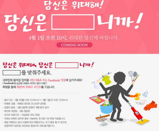기획전 오픈을 앞두고 현재 티저 이벤트를 진행 중이다. 4월 1일 까지 빈칸에 들어갈 단어를 해당 기획전 페이지 내의 Q&A 게시판 또는 Facebook에 댓글로 남기면 추첨을 통해 20명에게 3만 위메프 포인트를 제공한다.