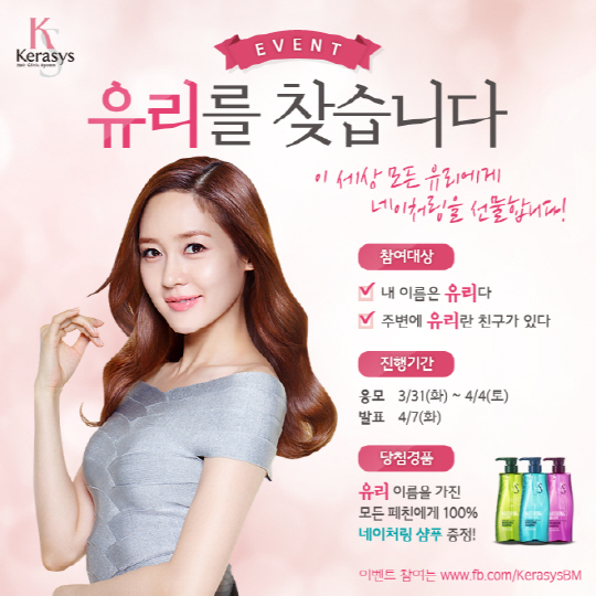 '유리찾기 이벤트'는 4월 4일까지 케라시스 모델 성유리와 이름이 같거나, 주변에 유리라는 친구 혹은 지인이 있는 소비자가 케라시스 페이스북(www.fb.com/KerasysBM)에 좋아요를 누르고 성유리에게 응원메시지를 댓글로 남기면 된다. 2015 케라시스 모델 성유리와 이름이 같은 모든 '유리씨'에게는 케라시스 네이처링 샴푸를 증정하며, '유리'라는 이름을 가진 친구를 태그한 이벤트 참여자 10명을 추첨해 아메리카노 기프티콘을 증정한다.
