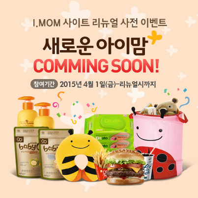 한편, 아이맘 사이트 리뉴얼을 맞이하여 '리뉴얼 미리보기', '첫인상 남기기', 'D-day 맞히기'등 누구나 쉽게 참여할 수 있는 다양한 이벤트가 준비를 진행한다. 경품으로는 10만원 상당의 보령메디앙스 브랜드 상품 및 현금처럼 사용하는 아이맘 플러스포인트를 제공한다. 보령메디앙스 아이맘이 제공하는 다양한 이벤트는 아이맘 사이트(www.i-mom.co.kr) 이벤트/쿠폰 페이지에서 참여할 수 있다.