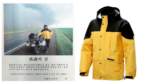 6개월간의 유라시아 대륙 모터바이크 여행 후 방용주 고객은 세일어패럴에서 생산한 제비표우의의 뛰어난 품질과 자신의 여행에서의 유용함에 감사 인사를 전하기 위해 최연구 대표에게 편지를 보내온 것이다.