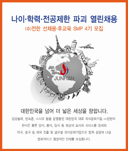 강강술래를 운영중인 ㈜전한(대표이사 최종만)이 우수한 외식인재 양성을 위한 채용 프로그램에서 나이·학력·전공 제한을 없앤 열린 채용을 실시한다.