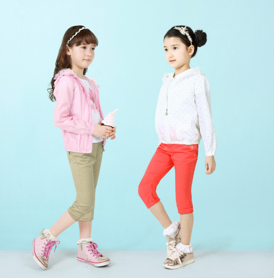 여아 윈드브레이커 제품은 화이트와 핑크 색상 2종으로, 레이스와 도트로 포인트를 줘 화사한 봄의 느낌을 살렸다. 남아 윈드브레이커 제품은 화이트와 오렌지, 그린과 블루, 레드와 그레이 등의 배색으로 연출된 3종의 댄디한 스타일이다. 특히 가슴 포켓에 지퍼 디테일을 살려 디자인에 포인트를 가미했다.