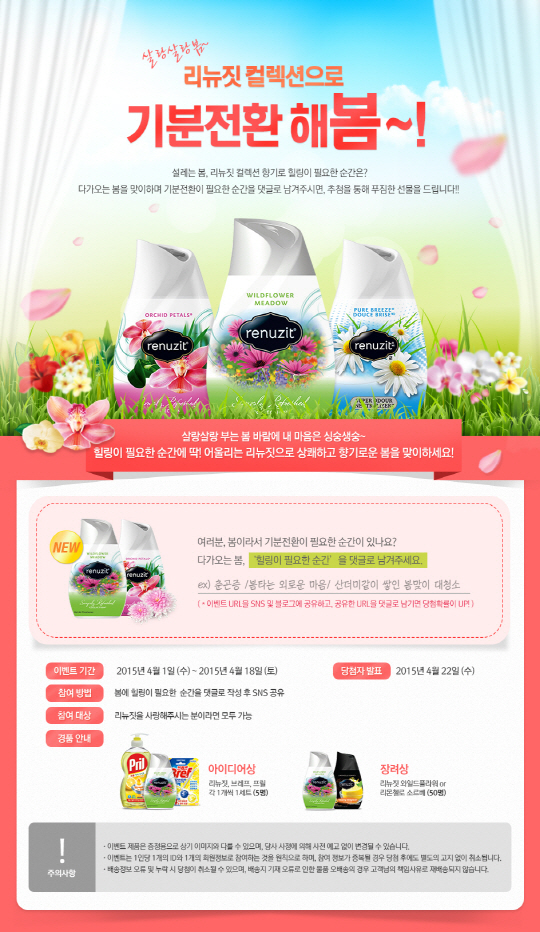 이벤트는 18일까지 헨켈홈케어코리아 홈페이지(www.henkelhomecare.co.kr) 내 이벤트페이지에서 진행된다. 참여방법은 봄에 춘곤증, 외로움, 대청소 등 힐링이 필요한 순간을 짧은 댓글로 남긴 뒤 자신의 SNS에 공유, 이 URL을 홈페이지에 남기면 된다. 누구나 참여 가능하다.