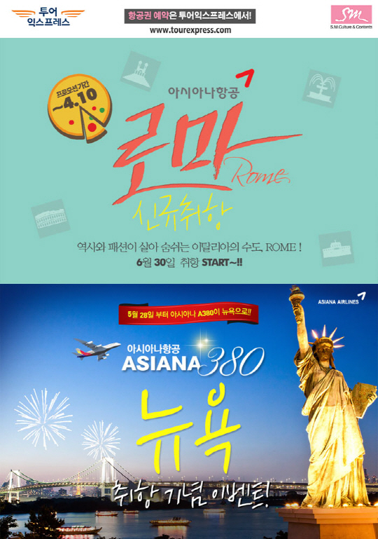 한편, 아시아나항공 로마 및 뉴욕 A380 신규취항 이벤트의 자세한 내용은 SM C&C 투어익스프레스 홈페이지(http://www.tourexpress.com)에서 확인 가능하다.