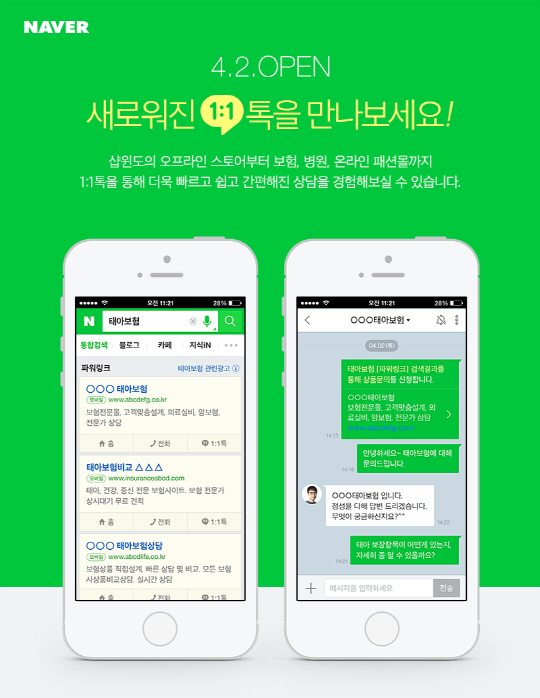 모바일 검색광고로 확장되는 1:1톡도 이용자와 사업자가 간편하게 대화할 수 있게 한 기능으로 사업자가 1:1톡을 설정하면 톡 버튼이 노출되며, 이용자는 이 버튼을 통해 사업자와 상품 관련된 문의 및 상담을 실시간으로 진행할 수 있다.