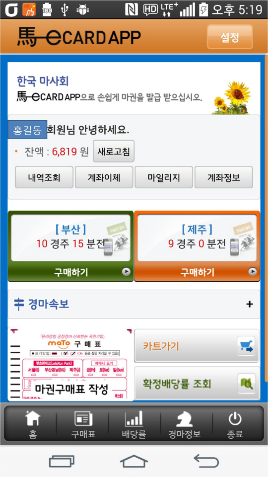 시범도입을 통해 성과는 입증됐다. 마사회는 지난해 8월부터 최근까지 전국 3개 렛츠런파크(서울·부산·제주)와 렛츠런CCC 의정부에서 마이카드앱을 시범 운영했다. 고객 호응도 조사 결과 마이카드앱을 이용한 마토 구매와 마이카드앱 이용인원은 각각 매달 30%, 14%씩 증가한 것으로 나타났다. 재이용 의사는 99%에 달해 사실상 첫 경험이 지속적인 구매로 확대되는 추세를 나타냈다. 마사회는 폭발적인 호응에 힘입어 이달부터 도봉, 강북, 강동, 분당지점을 시작으로 마이카드앱 서비스 적용 사업장을 단계적으로 확대하기로 결정했다. 마사회 측은 오는 7월엔 전국 렛츠런CCC에서 마이카드앱 이용이 가능할 것으로 내다보고 있다. 이용대상도 기존 실명 회원 대상에서 비실명 회원, 1일 사용 가능한 일일계좌(비실명) 이용자까지 가능하도록 했다. 마이카드앱은 마사회 모바일 홈페이지에서 무료로 다운 받을 수 있다. 회원가입은 계좌회원 전용창구, 일일계좌는 일반 유인창구에서 쉽게 개설할 수 있다.