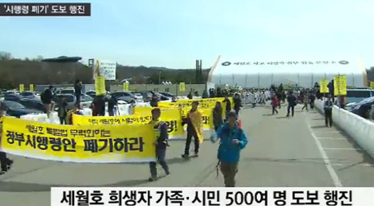 4일 4.16가족협의회와 세월호 참사 국민대책회의가 세월호 특별법 시행령 폐기와 세월호의 온전한 인양을 촉구하는 도보 행진에 나섰다.