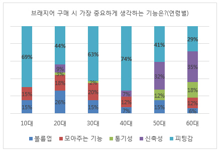 같은 성별의 여성이지만 연령대에 따라 속옷 구매 시 중요하게 생각하는 기능이나 디자인에 차이를 보였다. <브래지어 구매 시 가장 중요하게 생각하는 기능>은 신체 사이즈에 맞는 피팅감(54%)을 꼽았다. 다음으로 볼륨업 기능(19%), 모아주는 기능(12%), 신축성(11%), 통기성(4%) 순으로 조사됐다. 10~40대 여성은 피팅감을 가장 중요하게 생각하는 반면, 50~60대 여성의 30% 이상은 신축성도 중요한 요소로 꼽아 연령대별 차이를 보였다. 신축성이 좋은 브래지어는 몸을 조이지 않아 혈액순환이나 심장 기능에 무리가 생기지 않도록 돕는다. 또 처진 군살과 체형을 잡아주고 활동하기 편하기 때문에 50~60대 여성이 중요하게 생각하는 것으로 분석된다.