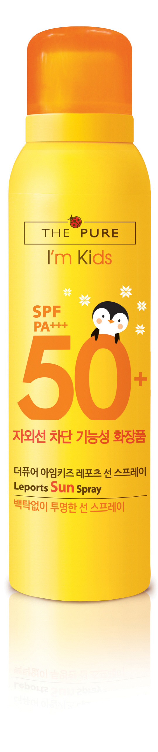 '더 퓨어 아임키즈 레포츠 선 스프레이'는 야외활동시, 전신에 뿌려서 사용할 수 있는 제품으로 자외선 차단은 물론 친환경 DME 가스를 사용한 피부에 안전한 멀티 기능성 자외선 차단제이다. 스프레이 제품에 흔한 백탁현상없이 젖은 피부에도 깔끔하게 사용할 수 있는 것이 특징이다.