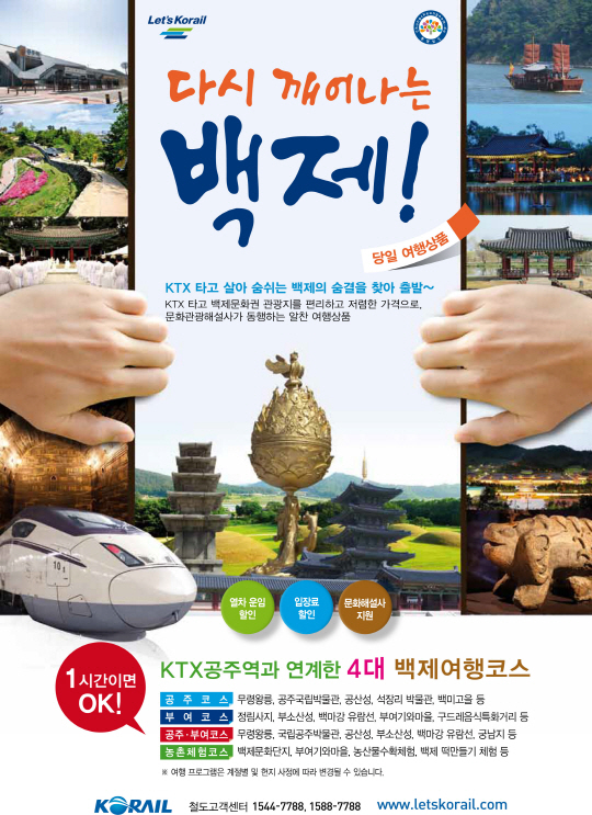 코레일과 충청남도가 올 봄 호남선 KTX 개통에 맞춰 선보인 공주역을 이용해 백제문화권을 여행할 수 있는 상품 'KTX공주역 4대 여행코스' 가 그것. KTX가 새롭게 정차하는 공주역과 백제문화권 여행 활성화를 위해 마련한 기차 연계 관광 상품으로, 상품 가격도 5만 원대로 저렴하게 구성돼 있다. 전 상품 모두 오전 용산역에서 호남선 KTX를 타고 출발해 공주역에서 버스로 백제 문화권 관광지를 둘러보고 KTX로 서울로 돌아오는 당일 일정으로, 문화해설사가 동행하는 알찬 상품이다.