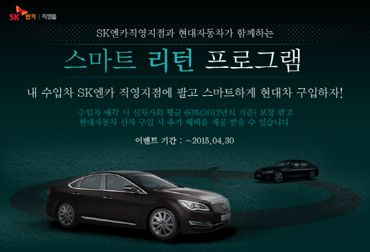 SK C&C 엔카사업부는 현대자동차와 공동 마케팅을 통해 SK엔카 직영지점에 타던 수입차를 매각하면 신차 할인 혜택을 제공하는 '스마트 리턴 프로그램'을 30일까지 실시한다고 8일 밝혔다.