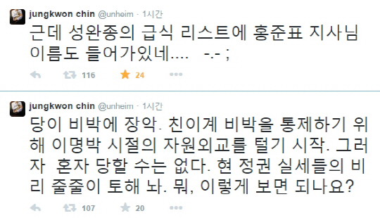 진중권 교수는 자원외교 비리 의혹으로 검찰 수사를 받다가 스스로 목숨을 끊은 성완종(64) 전 경남기업 회장이 정권 실세에게 거액의 금품을 제공했다는 메모가 발견됐다는 보도에 대해 10일 오후 자신의 트위터에 "근데 성완종의 급식 리스트에 홍준표 지사님 이름도 들어가있네..."라고 짧지만 강렬한 멘트를 썼다.