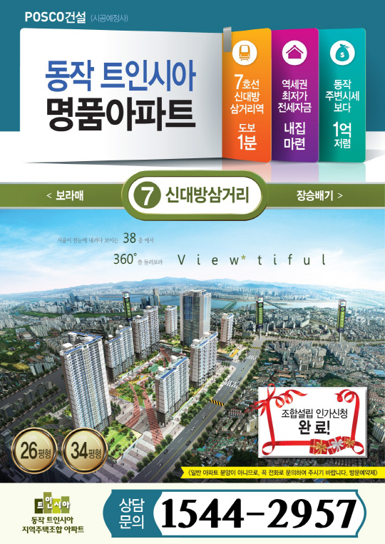 동작트인시아는 현재 총935세대 중 장기쉬프트 231세대를 제외하고,조합원 모집중인 704세대의 26평은 이미 마감이며 34평도 마감임박을 앞두고 있는 상황이다. 자세한 사항은 동작트인시아 홍보관 1544-2957에 문의하면 된다.