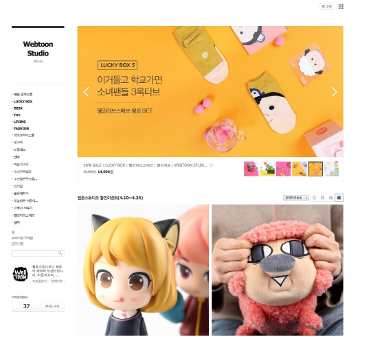 네이버 웹툰&웹소설CIC(대표 김준구)가 12일 웹툰 캐릭터 상품을 판매하는 '웹툰 스튜디오' 온라인숍(http://storefarm.naver.com/webtoonstudio)을 오픈했다고 밝혔다. 네이버 측은 "웹툰 캐릭터 상품을 구매하고 싶어도 두 곳뿐인 오프라인 매장에 방문하기 어려워 구매하지 못했던 사람들을 위해온라인숍을 오픈했다"고 밝혔다.