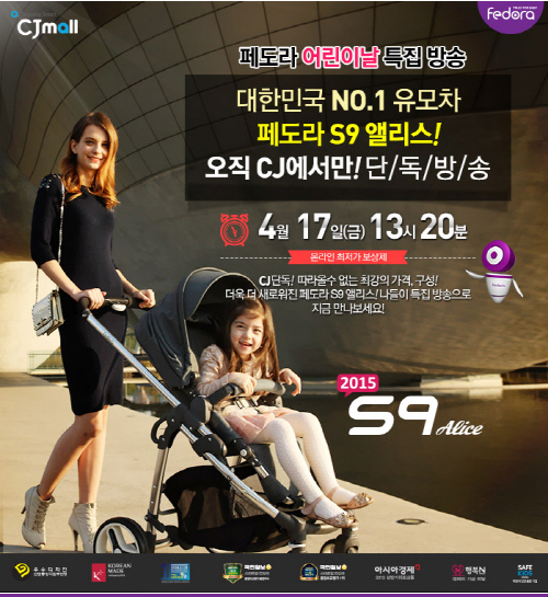 글로벌토털유아용품브랜드 페도라(Fedora, www.fedora.co.kr)가 17일 오후 1시 30분부터 약 70분간 CJ오쇼핑에서 2015 페도라 S9앨리스(Alice)유모차와 페도라 올라운드 카시트 C3 단독 방송을 진행한다.