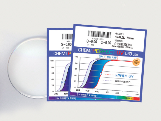 국내에서 시판되고 있는 UV차단 안경렌즈 제품들은 자외선 차단이 380㎚ 파장대까지만 보호가 돼, 기능에 한계가 있다. 이번에 나온 케미 퍼펙트UV 렌즈는 최고 영역대인 400㎚4까지 100% 가까이 자외선을 차단할 수 있다. 유해광선 420㎚ 영역까지도 부분 차단하며 가시광선 중 단파장(청색광)영역까지 부분 차단할 수 있다.