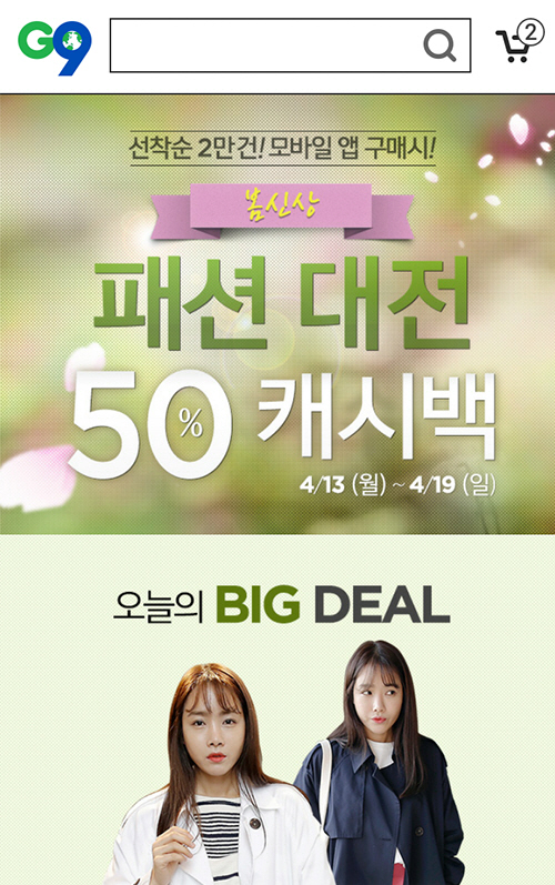 큐레이션 커머스 G9(www.g9.co.kr)와 온라인쇼핑사이트 G마켓(www.gmarket.co.kr)이 봄을 맞아 패션상품 할인 및 캐시백 행사를 진행한다.