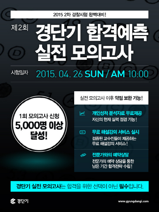 경찰시험전문 '경단기(www.gyungdangi.com)'가 5월 30일 시행되는 2015년 2차 경찰공무원 시험을 준비하는 '제 2회 합격예측 실전 모의고사'를 온·오프라인에서 진행한다.