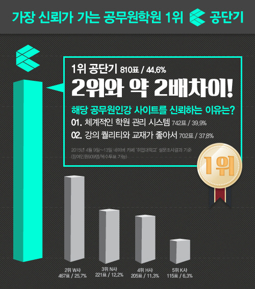 취업전문 네이버 카페인 취업대학교에서 취준생을 대상으로 설문조사를 진행한 결과, '가장 신뢰가 갔던 공무원 학원은?'이란 질문에 공단기가 총 44.6%를 차지해, '취준생들이 뽑은 가장 신뢰가 가는 공무원 학원' 1위에 올랐다.
