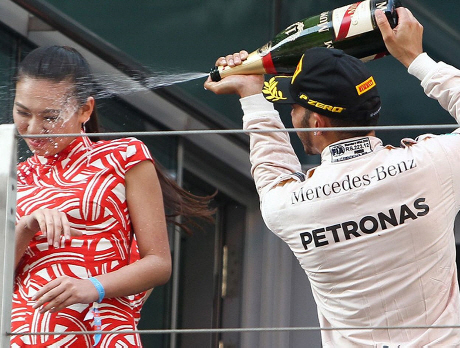 그는 레이스 시상 전통에 따라 샴페인을 터뜨리며 환호했다. 그런데 문제는 그가 시상식 도우미로 나선 중국 레이싱 걸에게 샴페인을 조준한 것이다.