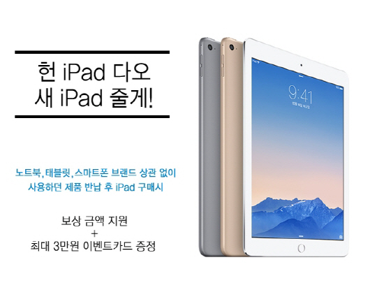 애플 전문 매장 프리스비가 15일 아이패드를 구매하는 고객대상에 혜택을 주기 위해 보상 판매 서비스를 확대 실시한다고 밝혔다. 프리스비에 따르면 아이패드 에어2를 구입하려는 고객은 기존 사용하던 아이폰5S 또는 아이패드 에어 반납 후 아이패드 에어2 16GB를 구매할 경우 30만원 정도의 보상금액을 지원받아 50% 할인된 가격으로 새 제품 구매가 가능하다. 추가로 3만원 상당의 액세서리를 구매할 수 있는 이벤트 카드도 지급된다.