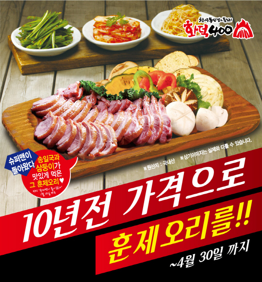 화덕400은 통삼겹&통오리 전문점으로 삼겹살, 목살, 갈매기살, 항정살 등 돼지고기를 전문적으로 판매하는 매장이다. 훈제오리 및 오리로스도 판매하고 있어 다양한 고객의 입맛을 사로잡아 가족외식 및 모임 장소로도 인기다. 4월 30일에는 화덕400 이수점 그랜드 오픈을 앞두고 있다.