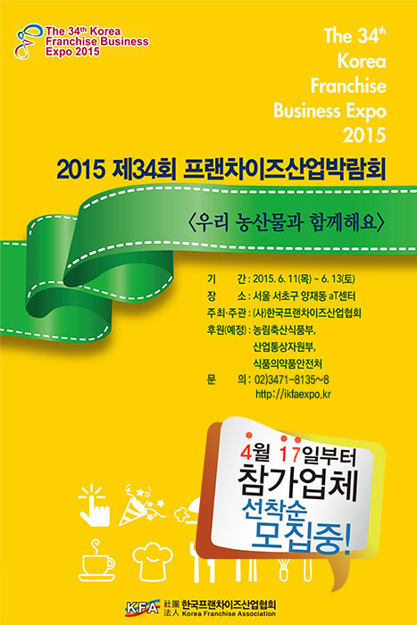 (사)한국프랜차이즈산업협회(회장 조동민)가 6월11일부터 13일까지 서초구 양재동 소재 한국농수산식품유통공사(aT)에서 개최되는 '제34회 프랜차이즈산업박람회'에 참가할 업체를 선착순 모집한다고 밝혔다.