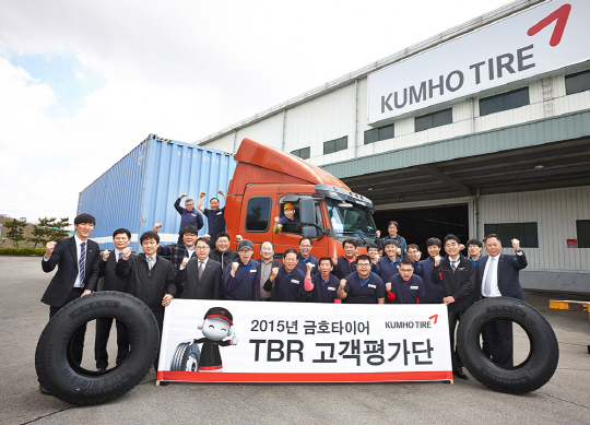 금호타이어는 14일 경남 양산물류센타에서 트럭버스용 타이어(이하 TBR) 고객평가단 발대식을 개최했다. 지난 2012년부터 4년째 실시중인 TBR 고객평가단은 대형트럭 운전 경력 10년 이상의 전문가 21명으로 구성되었다.