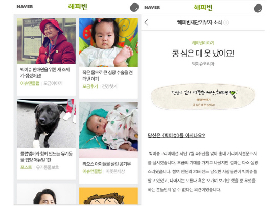 한편 네이버 해피빈은 기부에 참여하고자 하는 사람과 도움이 필요한 공익단체를 연결해주는 국내 최초의 온라인 기부 포털로, 올해 10년째 운영중이다. 기부자가 네이버 해피빈을 통해 소개되고 있는 다양한 기부테마와 공익단체에 자신이 보유한 가상 화폐인 '콩'을 기부하면, 해피빈이 해당 단체에 기부금을 전달하는 방식으로 운영되고 있다.
