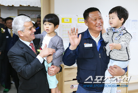 | 한국지엠주식회사는 16일 부평 본사 부근에 직원 자녀를 위해 신축된 '한국지엠 어린이집'의 개관식을 가졌다. 어린이집을 방문한 한국지엠 세르지오 호샤 (Sergio Rocha) 사장과 정종환 노조위원장. |
