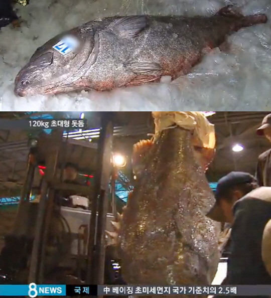 이 돗돔은 몸 길이가 웬만한 성인 키보다 큰 1.8m에 무게는 120kg로 지게차가 움직여야 겨우 들어 올릴 수 있을 정도다.