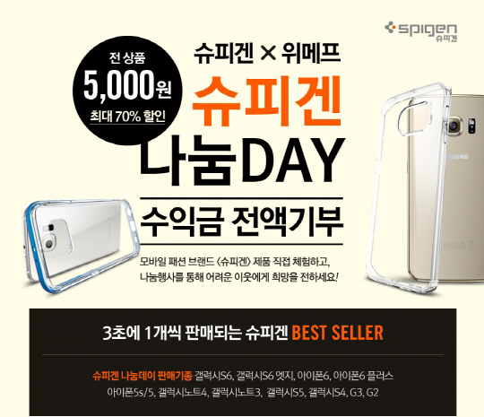 나눔DAY 프로모션은 슈피겐과 위메프가 소외계층을 돕기 위해 공동으로 마련한 자선행사로 오는 28일부터 30일까지 삼성동에 위치한 위메프 신사옥에서 진행된다. 행사기간 동안 신제품 갤럭시S6·S6엣지는 물론 아이폰 시리즈 및 LG G 시리즈 등 다양한 프리미엄 케이스를 모두 최대 70% 할인된 금액인 5000원에 구매할 수 있으며, 판매수익금은 전액 사회단체에 기부되어 주변 소외이웃을 위해 쓰일 예정이다.