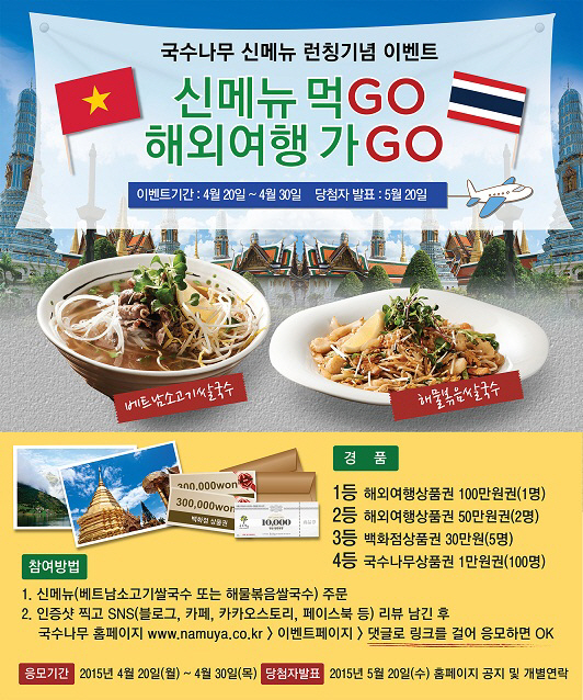 응모기간은 4월 30일까지다. 당첨자 발표는 5월 20일이며 1등 1명에게는 100만원권의 해외여행상품권이 증정되며, 2등 2명에게도 50만원권의 해외여행상품권이 제공된다. 3등 5명에게는 30만원권 백화점상품권이, 4등 100명에게는 1만원권의 국수나무상품권에 당첨경품으로 제공된다.