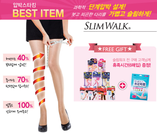 2015 S/S 시즌을 맞아 다리노출이 잦아지면서 각선미 관리에 여성들이 더욱 관심을 가지는 가운데, 기능성 압박스타킹에 대한 수요가 늘어나고 있다. 그 중 슬림워크는 다리를 가장 아름답고 건강하게 관리해준다는 황금비율 10:7:4의 압박법칙을 적용해 인체공학적으로 설계된 제품이다. 발목을 가장 강하게 잡아주고 종아리, 허벅지로 올라갈수록 압박력이 약해지는 구조이다.