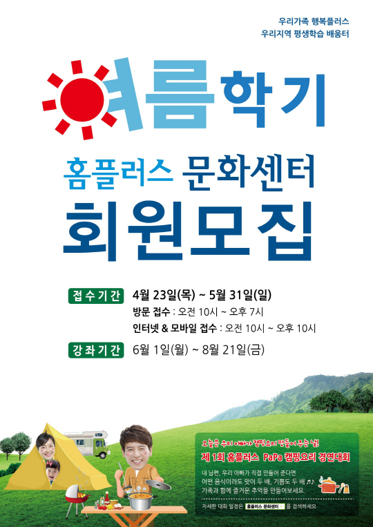 홈플러스 2015년 여름학기 강좌는 6월부터 8월까지 3개월간 진행되며 점별 평균 550여개, 총 7만여개의 강좌로 구성되어 있다. 이번 여름학기에는 '아빠 어디가! 우리가족 행복여행'을 테마로 '아빠가 배우는 캠핑 & 간편요리', '야외에서 돋보이는! 아빠 전용 놀이가이드', '온 가족이 행복한 아빠육아 & 살림 9단' 등 '아빠' 대상 강좌를 신규개설했다.
