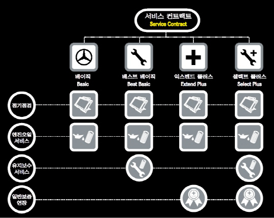서비스 컨트랙트는 베이직 (Basic), 베스트 베이직 (Best Basic), 익스텐드 플러스 (Extend Plus), 셀렉트 플러스 (Select Plus) 총 4종류로 구성되며 고객들은 필요에 따라서 자유롭게 선택할 수 있다.