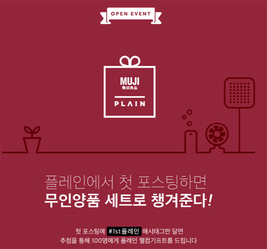 플레인 서비스 오픈을 기념하는 경품 이벤트도 진행된다. 4월 30일까지 열흘간 총 100명을 추첨해 무인양품 상품 3종으로 구성된 선물박스를 증정하는 이벤트다. 플레인 가입 후 첫 포스팅에 "#1ST플레인" 해시태그를 달면 이벤트에 자동 응모된다. 당첨 결과는 플레인 앱 공지사항과 홈페이지를 통해 공지된다. 플레인 서비스에 대한 자세한 내용은 서비스 소개 페이지(plain.kakao.com)를 통해 확인할 수 있다. <스포츠조선닷컴>
