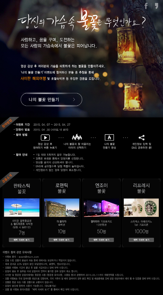 '불꽃릴레이'는 가족, 동료, 사랑, 열정, 꿈 등 각자의 인생에서 가장 소중한 의미를 부여하는 불꽃 이미지를 선택하고 페이스북에 공유하는 이벤트이다. 불꽃 이미지를 선택할 때마다 각각 다른 좋은 글귀를 같이 보여주면서 페이스북 상에서 하루 1만 명 이상, 누적 총 16만회 응모하는 등 화제를 모으고 있다.